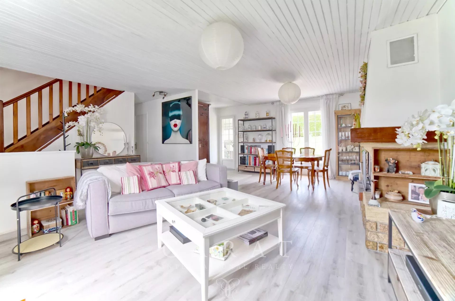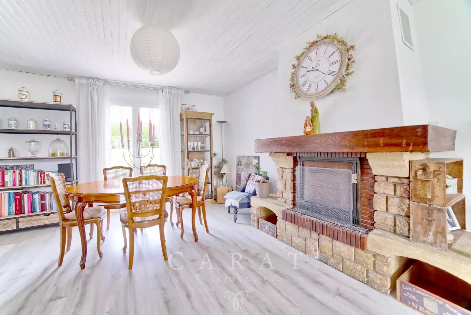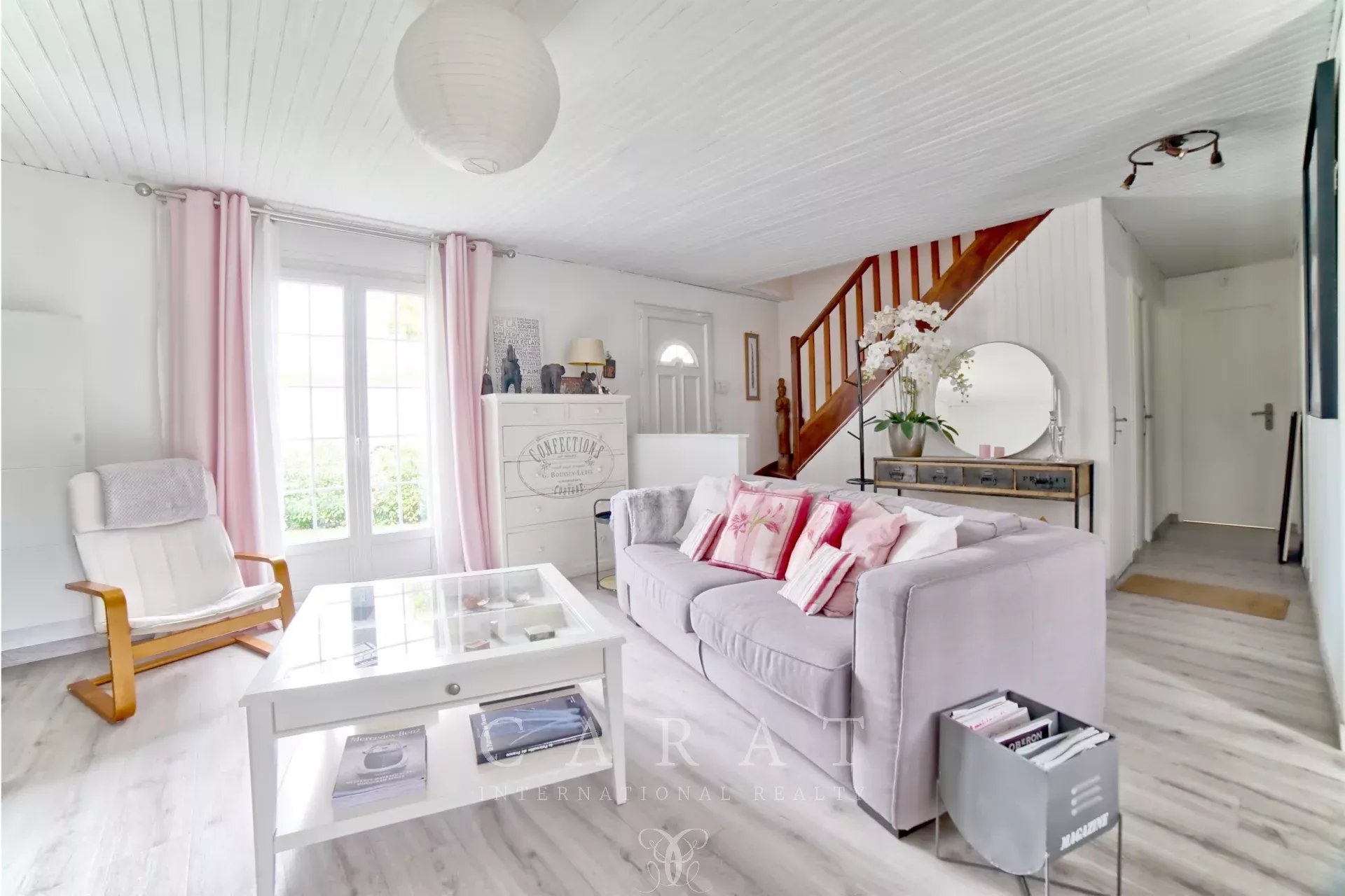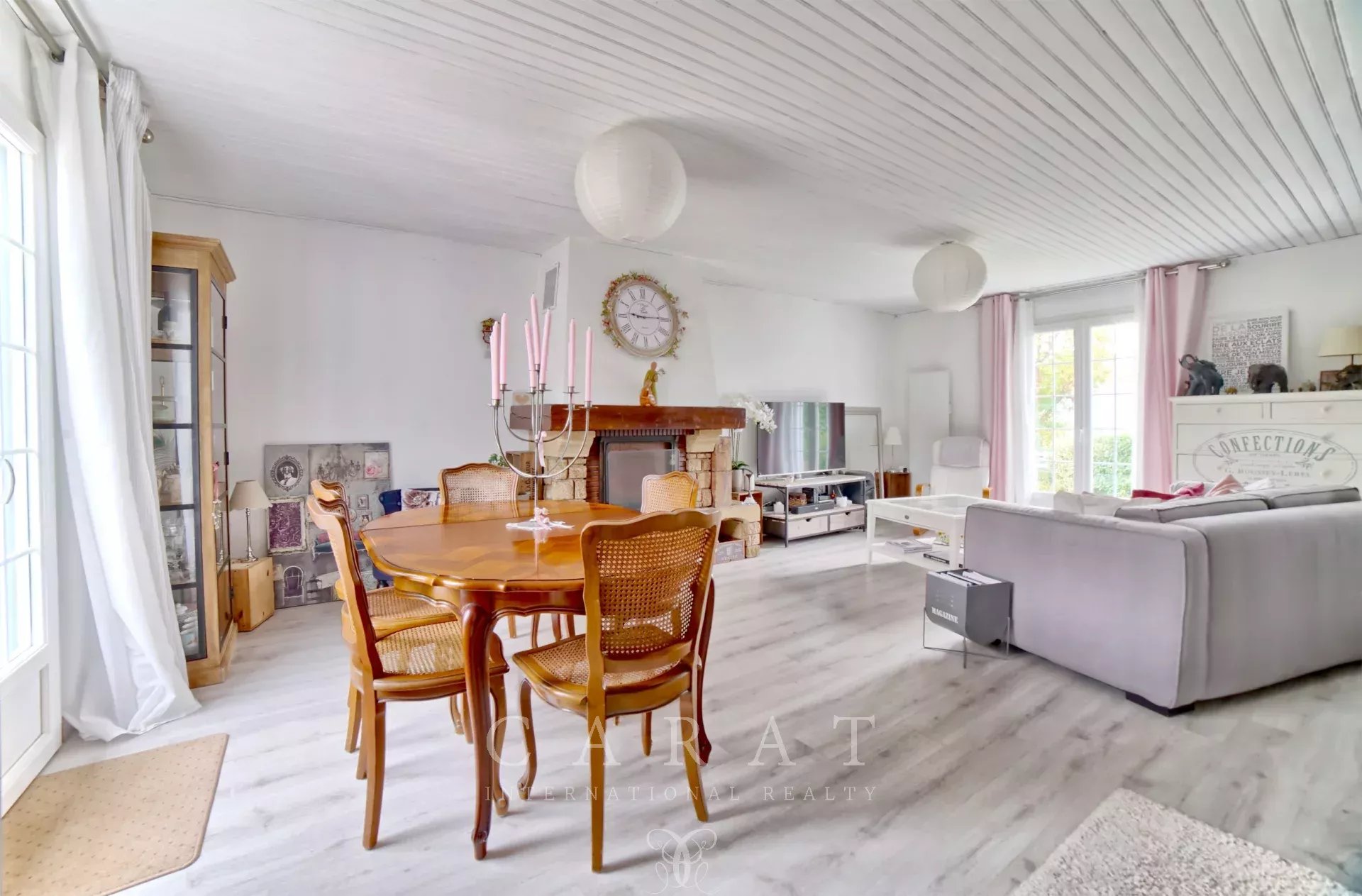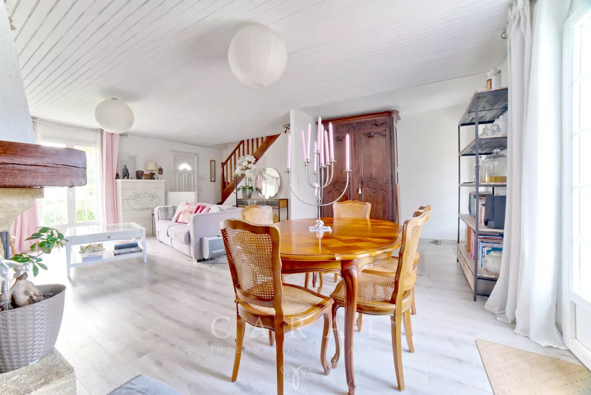 Dès l’entrée, le ton est donné : un intérieur chaleureux, fonctionnel et impeccablement entretenu. Le rez-de-chaussée accueille une grande pièce de vie, salon-salle à manger, traversante baignée de lumière, une jolie cuisine indépendante installée sous véranda, une chambre, une buanderie faisant office de dressing, une salle de douche et des toilettes invités.