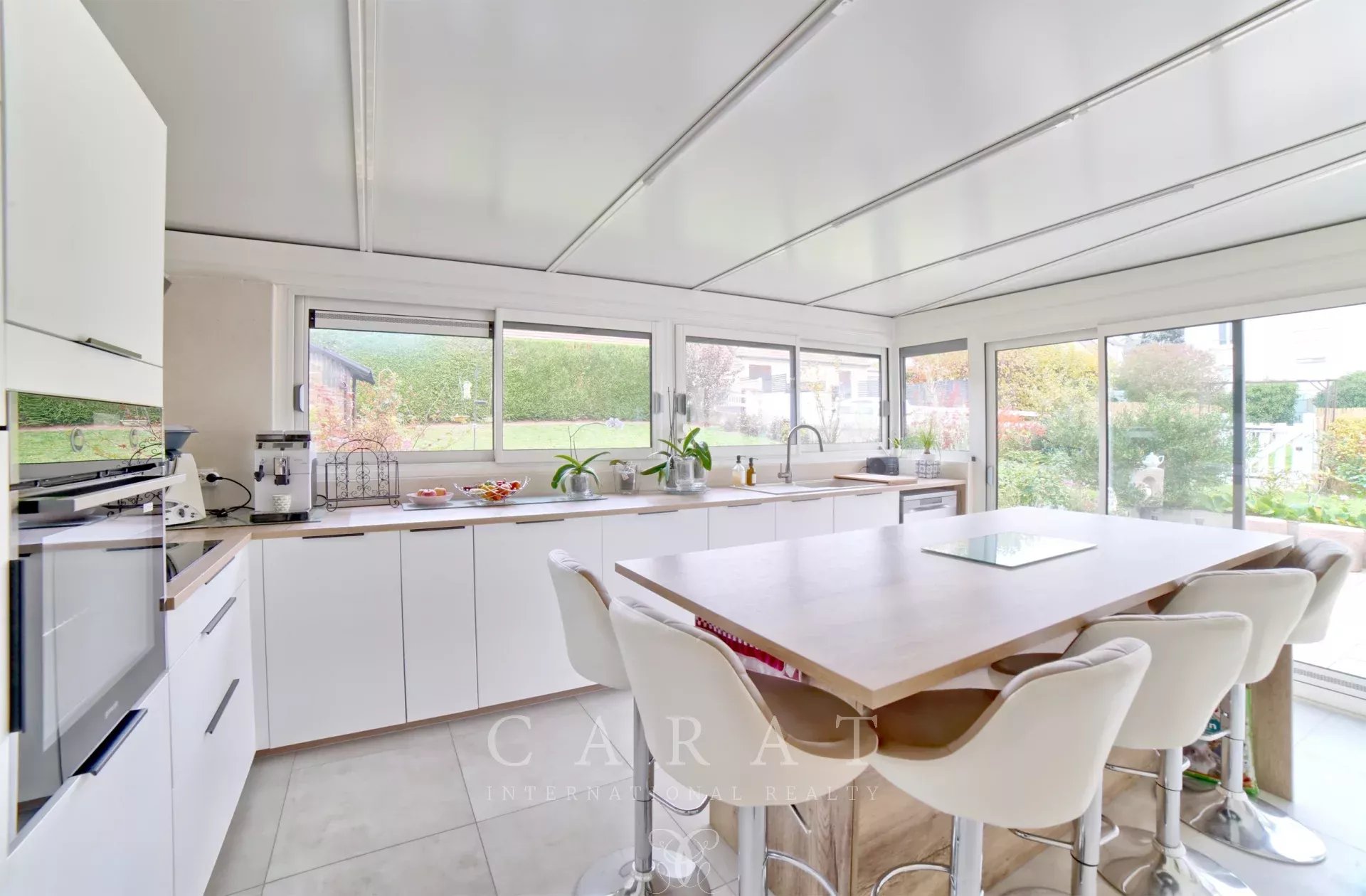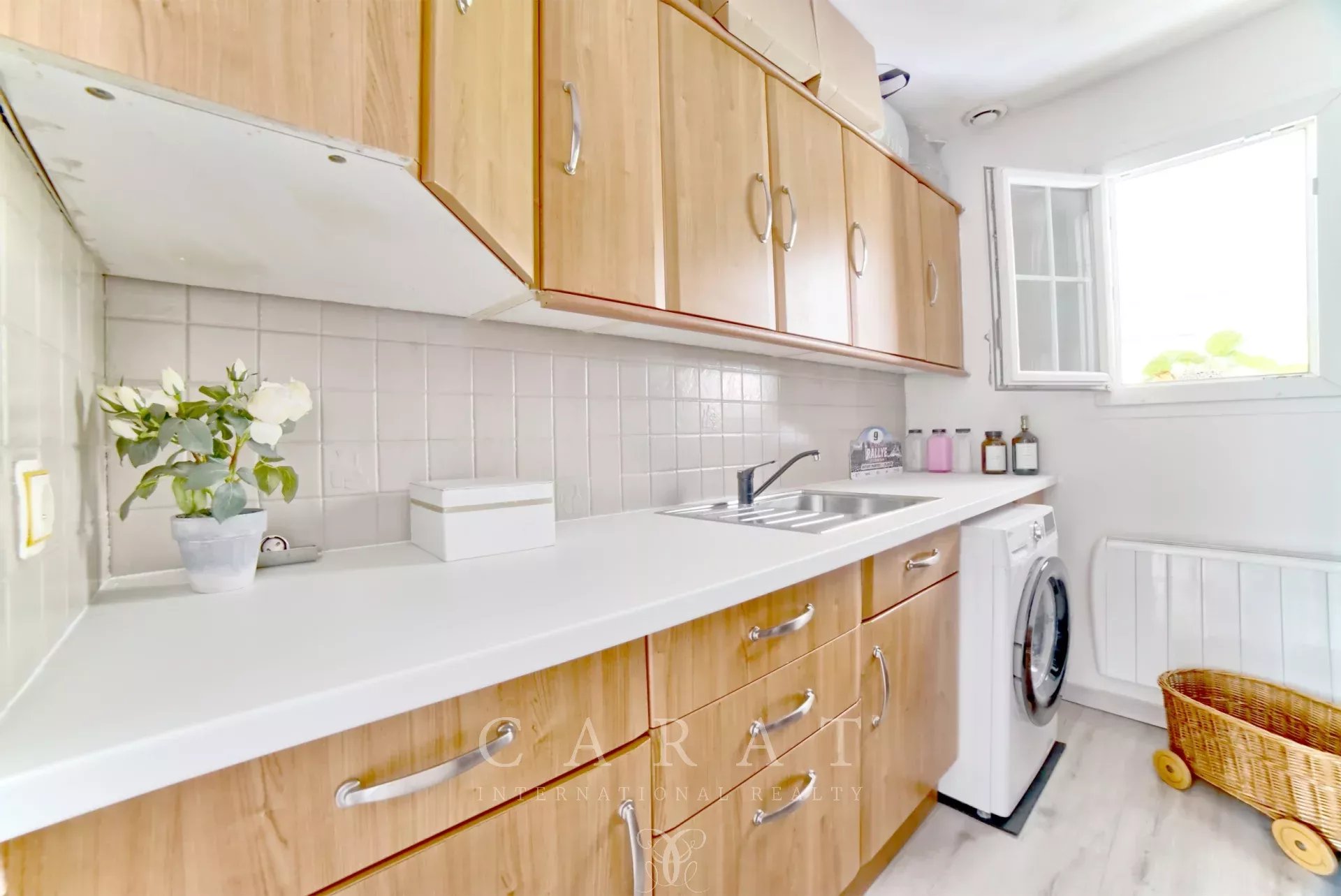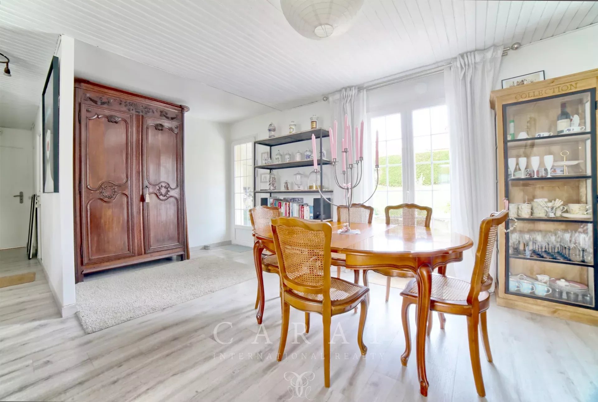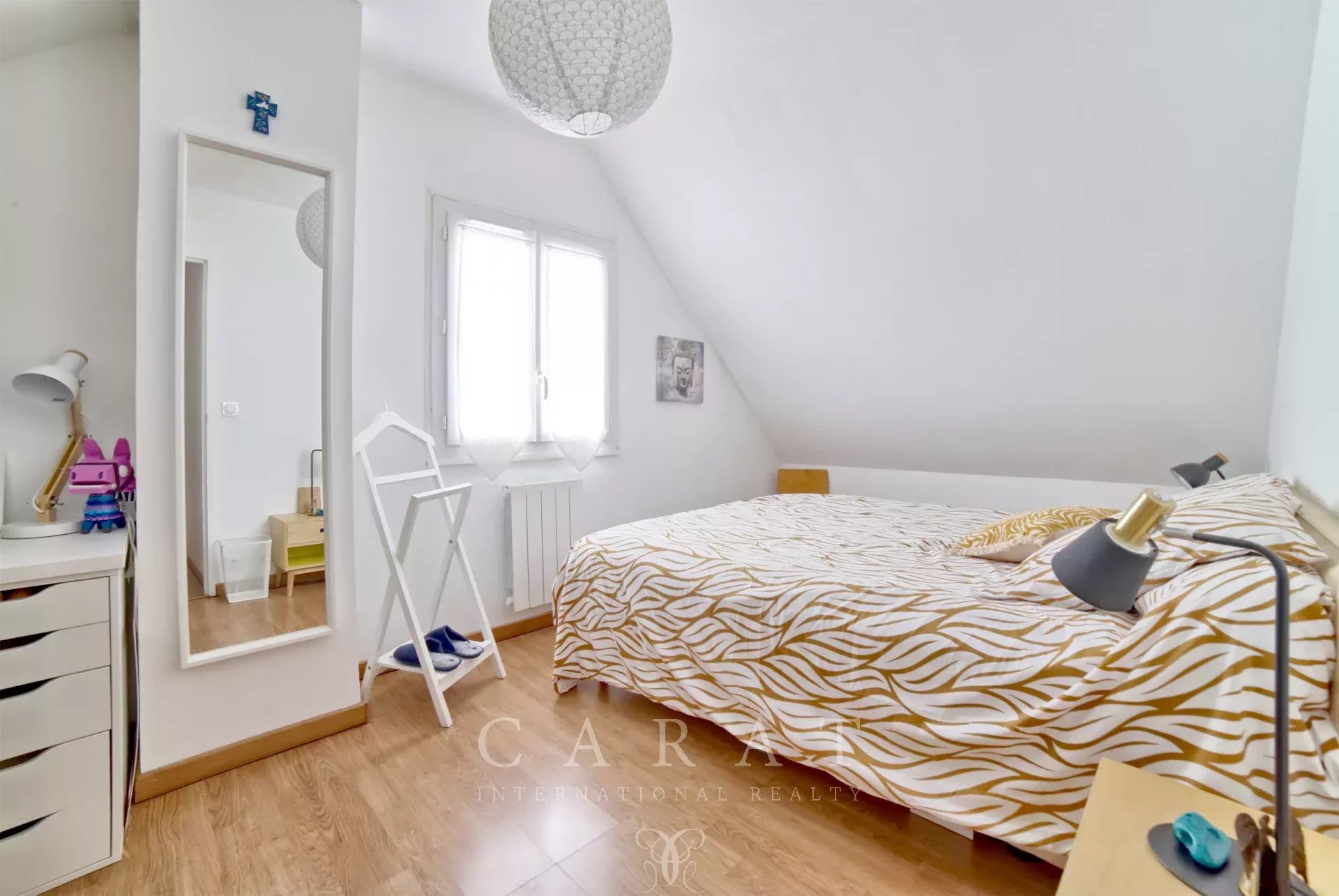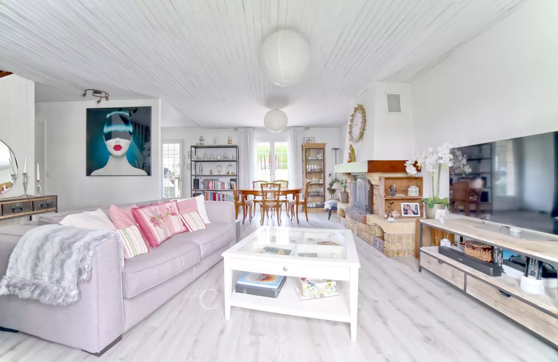 Dès l’entrée, le ton est donné : un intérieur chaleureux, fonctionnel et impeccablement entretenu. Le rez-de-chaussée accueille une grande pièce de vie, salon-salle à manger, traversante baignée de lumière, une jolie cuisine indépendante installée sous véranda, une chambre, une buanderie faisant office de dressing, une salle de douche et des toilettes invités.