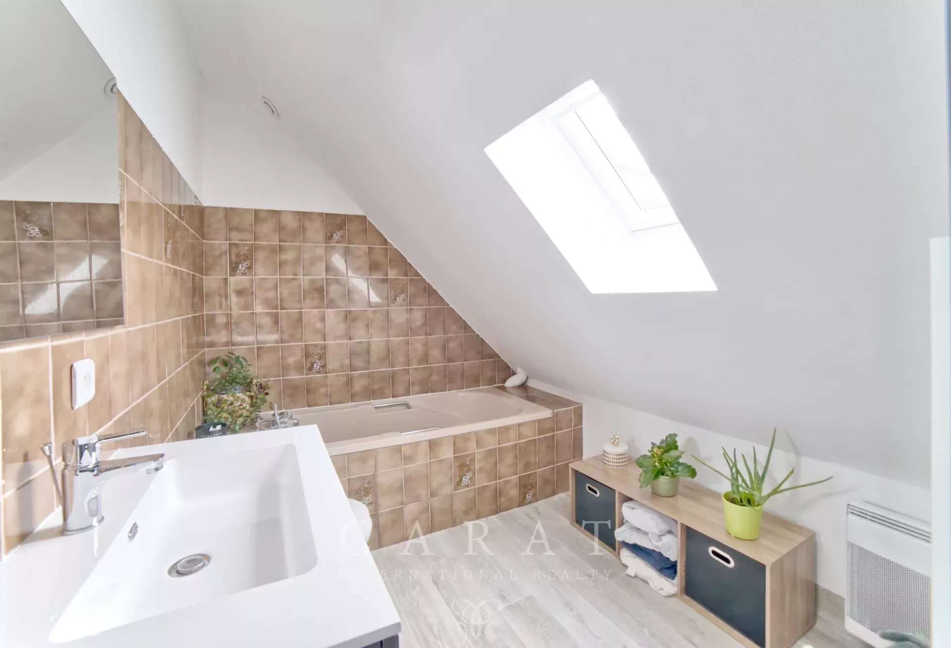 Le sous-sol total de 67 m² constitue un véritable atout : garage, espace de stockage et grande cave en terre battue viennent compléter cet ensemble.